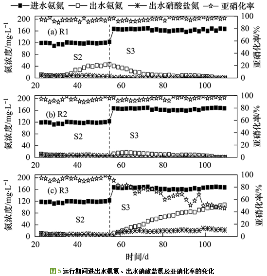 實(shí)驗(yàn)分為S1、S2、S3這3個(gè)階段:S1階段為亞硝化階段, 采用低碳氮比的人工配水啟動(dòng)亞硝化; S2階段為亞硝化污泥顆?;A段, 通過(guò)在R2、R3反應(yīng)器中分別添加20%的好氧顆粒污泥、20%除磷顆粒污泥以期加快顆?;M(jìn)程; S3階段為強(qiáng)化顆粒化階段, 通過(guò)增加進(jìn)水中的COD負(fù)荷和氨氮負(fù)荷, 促使亞硝化顆粒增大和提高系統(tǒng)的亞硝化性能.